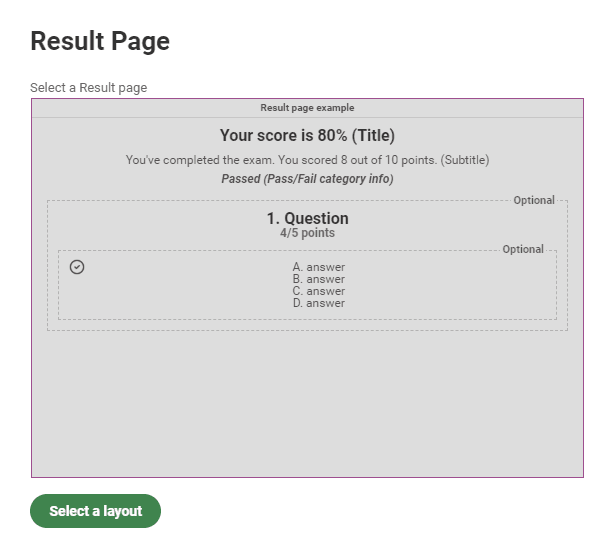 When you choose a layout for your result page, we show a visual, schematic representation of what it would look like in your exam. What you see is what you get.