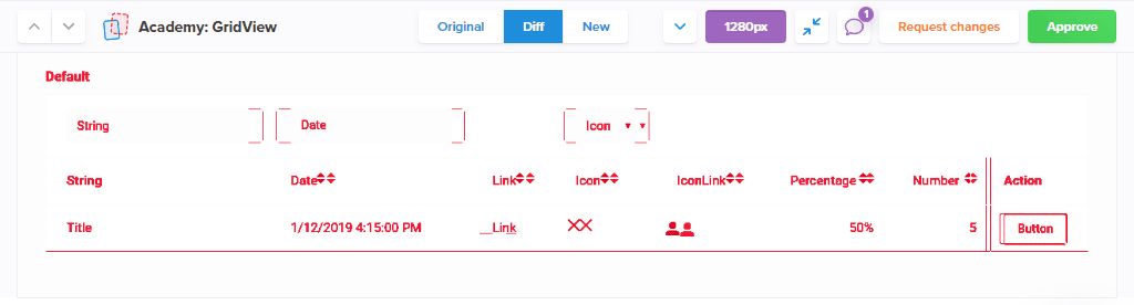 For each component we have developed in our Storybook component library, a screenshot is made. When we change a component a new screenshot is made, and the two are compared with each other side by side. Differences are then marked in red to show clearly what has changed: