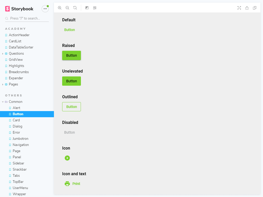 After creating lots of components that are the backbone of our interface, we organize them in Storybook. Storybook is a component explorer, or component library. It’s an efficient way to keep track of all our components. Each component gets its own story in Storybook, where all possible variations of a component can be viewed: