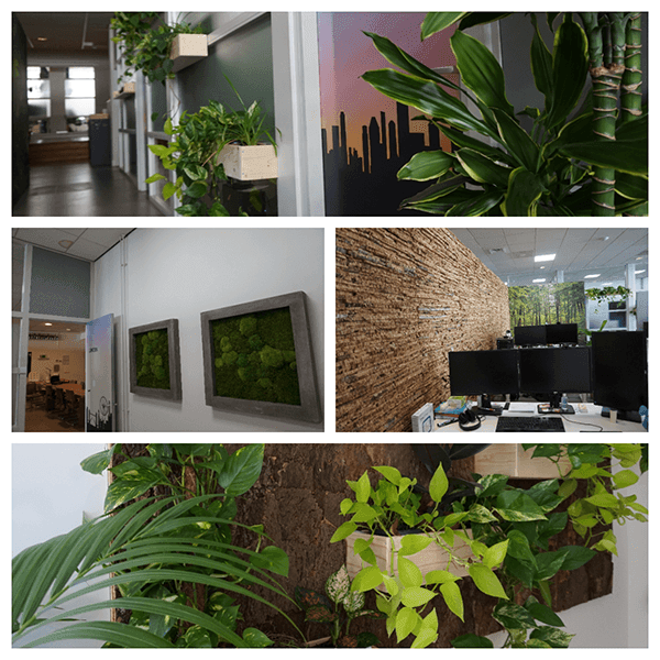A green office is a happy office! We believe that a plant-rich environment contributes to happy, healthier, and more productive employees. That's why we have moss panels in our meeting rooms, hanging plants, and containers full of air-purifying plants in our work areas! We made the containers ourselves from sustainable materials!
