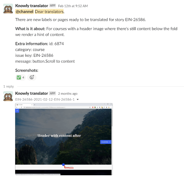 The next job was to communicate our challenge and expectations with the translators: react to the webhooks as they arrive, ideally within 24 hours. We were curious how this would be received, but the team adapted quickly. Slack is ideal for instant messages, a quick thumbs-up, or a check mark. We followed up by drafting a small translation manual to explain how we'd like things to work, and why, and addressed some common questions. We pinned this to the Slack space for the team to reference whenever needed.