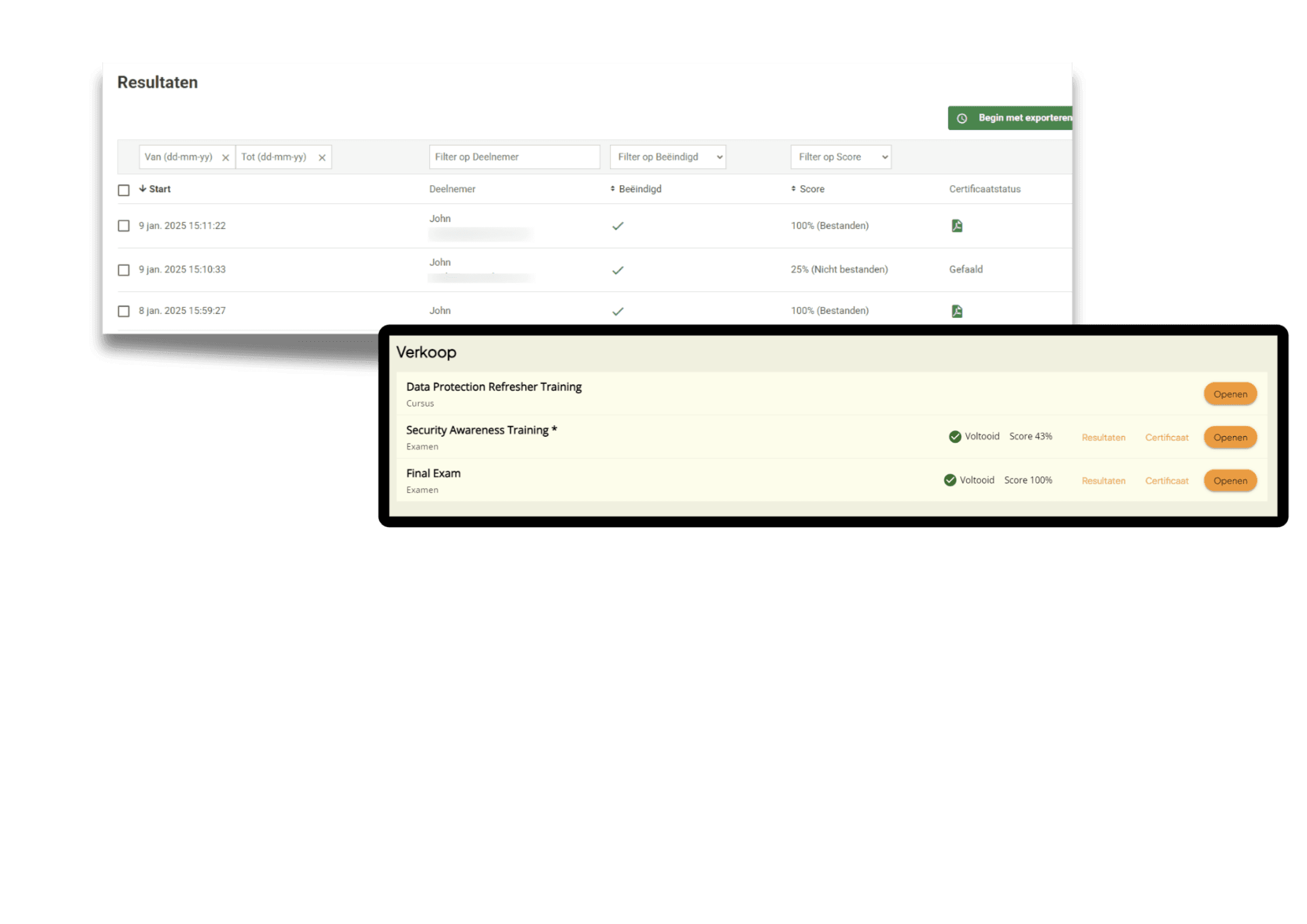 Certificaten zijn optioneel, hierdoor kan je trainingsprogramma's maken die bij iedereen passen, van korte sessies tot strenge cursussen met strikte regels.
